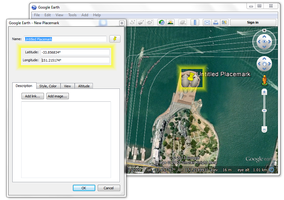 An easier way is to go through the motions of adding a Placemark to the image. Select the menu option and a flashing box and pushpin will be displayed. Drag this to the desired location and release the mouse button, which will display the coordinates in text boxes that you can copy directly into the program using the Windows Clipboard in the usual way. This is also shown below: