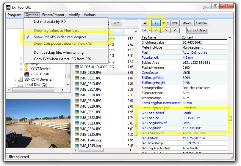 If your smartphone is equipped with a camera and GPS unit, or if you have a GPS-enabled digital camera, just take a photo! The coordinates, along with a whole lot of other information about the photo and/or camera, will normally be automatically saved in the photo's metadata, known as EXIF (if not, you may need to find an option on the phone setting that enables this feature). You can later view this information using a photo viewing program. We highly recommend the free ExifToolGUI, available from http://u88.n24.queensu.ca/~bogdan/, as seen in the screen capture below. Note that you may need to select the menu Options | Show Exif:GPS in decimal degrees (as highlighted). The GPS coordinates are also highlighted: