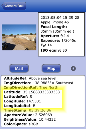 There may also be apps available for your smartphone that enable you to view this information without having to copy the photo to your PC first. On an iPhone we have used and recommend the free ExifWizard (available from the Apple AppStore), a screen capture of which is shown below:
