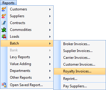 As you process loads, EPR transactions are accumulated internally within the program until such time as you create the contra combined RCTI/Tax Invoice. This avoids having large numbers of individual small transactions at any time. To generate the contra invoice select the Reports | Batch | Royalty Invoices menu as shown below: