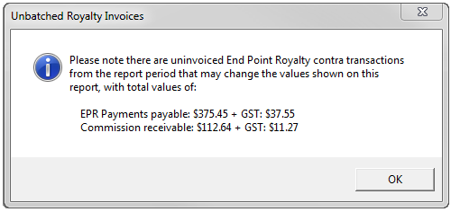 From version 3.3.15, an advisory prompt will be displayed if there are any unbatched EPR invoices with transaction dates in the reporting period for the report in question: