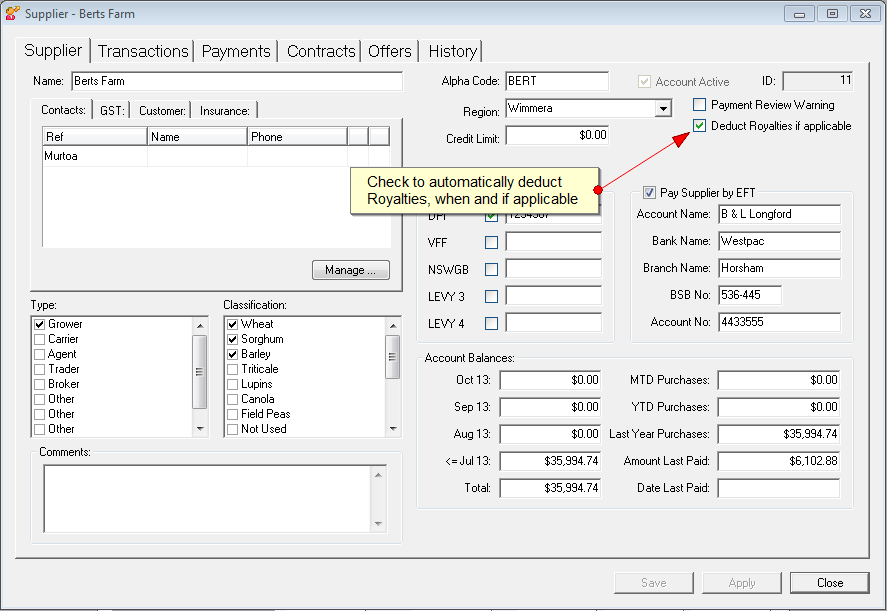 Because you do not want to deduct EPRs from loads bought from other traders you need to identify those suppliers that are subject to royalty deductions when and if these might be applicable. You do this by checking the Deduct Royalties checkbox on the Supplier window for affected growers: